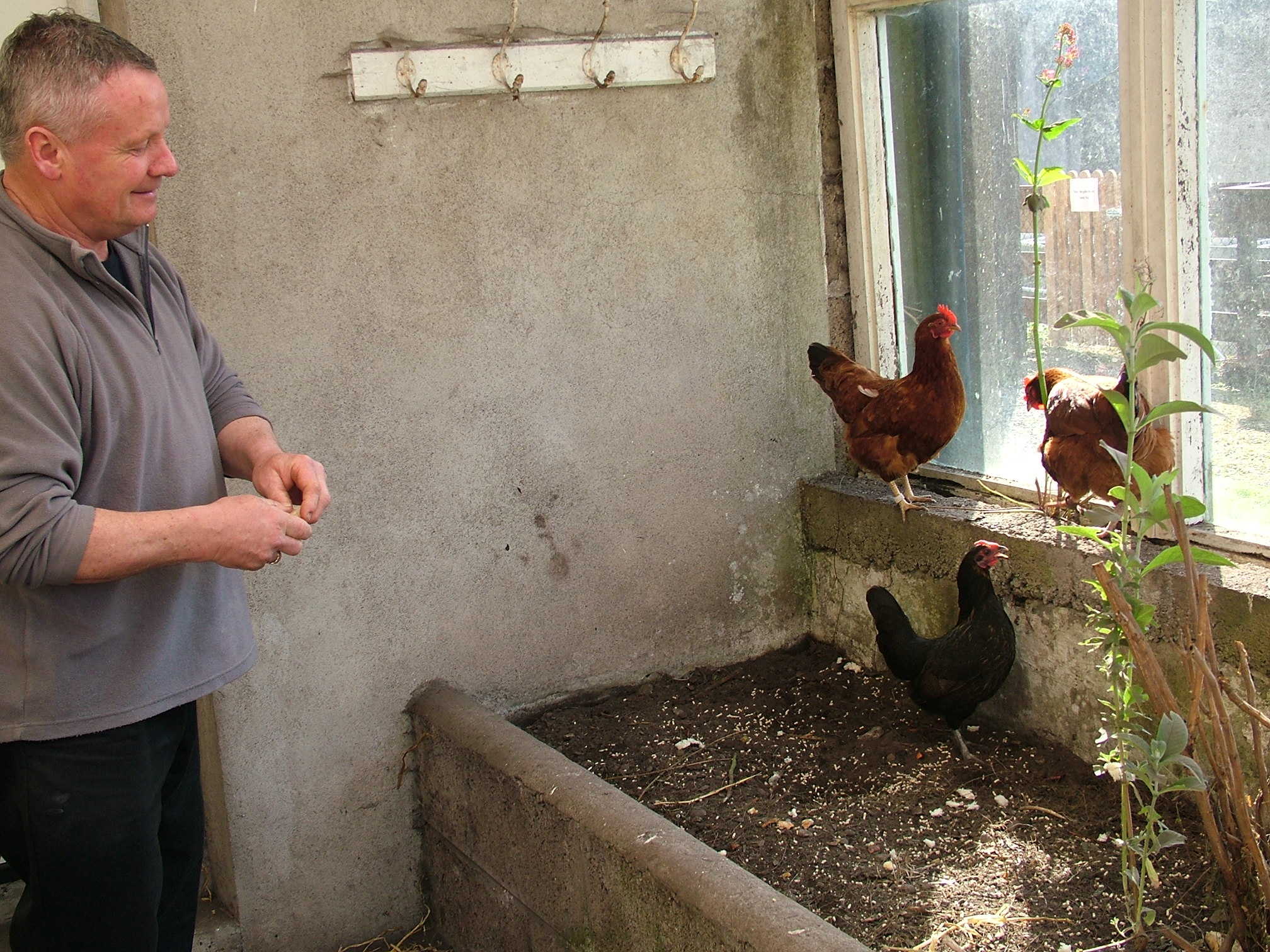 Séan feeding the hens